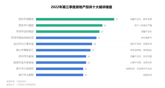 2022年第三季度,人民網(wǎng)地方領(lǐng)導留言板共收到房地產(chǎn)投訴約4.12萬起,與去年同期相比增長51.61%,較今年第二季度增長36.71%。值得關(guān)注的投訴事件有:南寧市興進珺府延期交房且交房條件不達標、菏澤市佳和雅園質(zhì)量不達標。