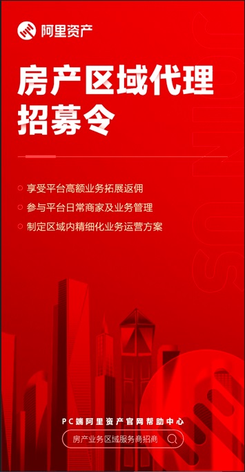 阿里資產(chǎn)房產(chǎn)區(qū)域代理招募工作現(xiàn)已全面啟動(dòng),誠(chéng)邀有志企業(yè)與阿里資產(chǎn)共同攜手,搶占10萬(wàn)億+市場(chǎng)規(guī)模,開拓“新房非住宅+二手房特價(jià)稀缺”的全新發(fā)展賽道!