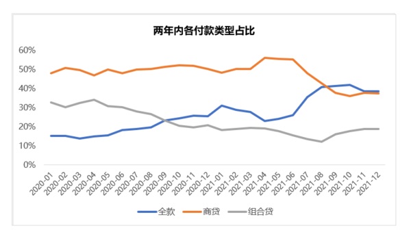 隨著2020年年底、2021年年初銀行收緊房貸業(yè)務(wù),南京、寧波、深圳、杭州等城市房貸利率上揚(yáng),甚至部分銀行還暫停了二手房貸款業(yè)務(wù)。在杭州,從1月起,貸款利率持續(xù)提升,至9月,首套房貸款利率提升至5.90%,二套房貸利率突破6.0%。由此,全款客戶占比不斷提升,由2021年1月的15%提升至2021年底39%。