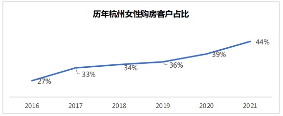 而在女性經(jīng)濟(jì)獨(dú)立的背景下,女性購房也成為新趨勢(shì)。貝殼杭州站購房客戶中,女性購房占比連續(xù)6年提升,“她勢(shì)力”進(jìn)一步凸顯,2021年女性購房占比已經(jīng)達(dá)到44%。在各年齡段中,90后女性購房比例高達(dá)48%,在各年齡段中占比最高。