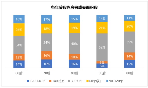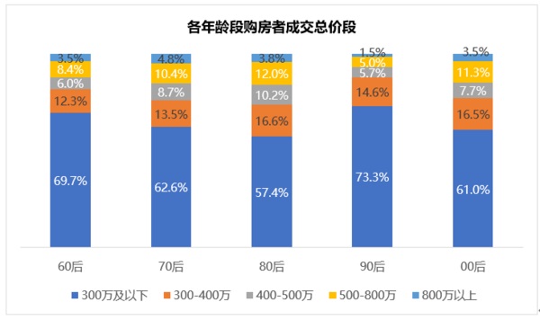 值得注意的是,尚未大批進(jìn)入職場(chǎng)的00后購買力強(qiáng)勁。接近30%的90后會(huì)購買120㎡及以上的房屋,在90后中,這一比例僅為13%。在成交價(jià)段上,購買500萬元以上房屋的00后占比達(dá)到14.8%,購買800萬元以上占比3.5%,遠(yuǎn)超90后!