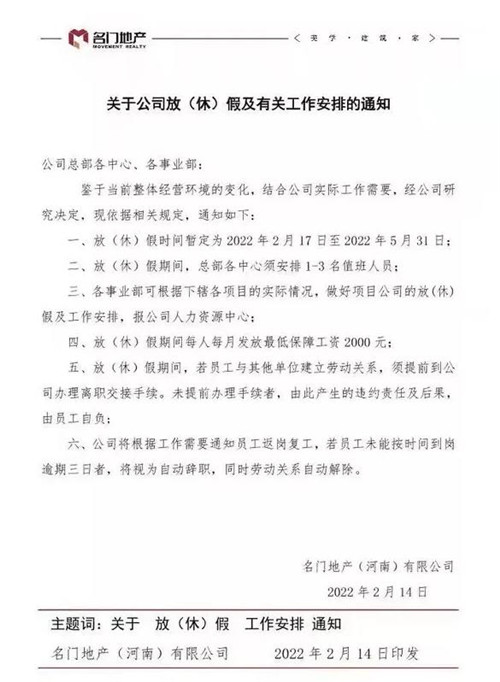 2月14日,名門地產(chǎn)發(fā)布了一則通知,讓全體員工強制“放長假”。按照這份通知,名門地產(chǎn)全體員工(除部分值班人員以外)從2月17日開始將放三個多月的集體長假。放假期間,公司總部各中心會安排1-3名值班人員。此外,在放假期間,公司會給每人每月發(fā)放最低保障工資2000元。
