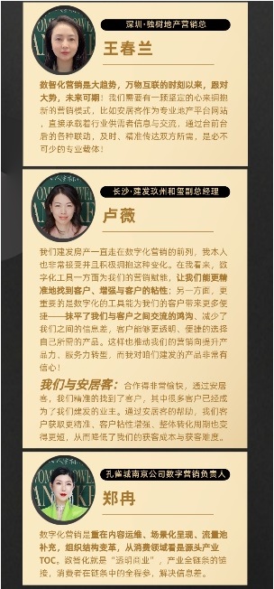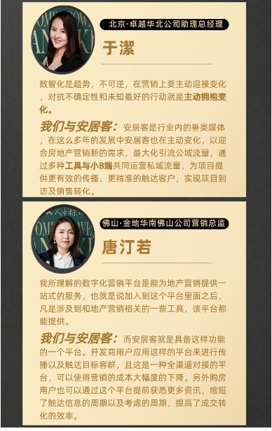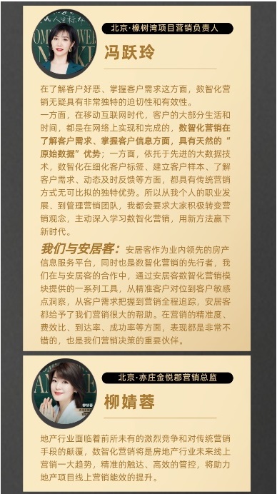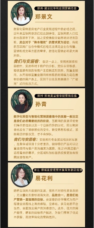 從采訪中看出,她們普遍認為房地產數智化營銷是大勢所趨,新營銷手段所帶來的數據精準度的提升、交易鏈路的縮短以及流量池的層層補充都是她們所看重的。下面我們看一下她們是怎么說的?