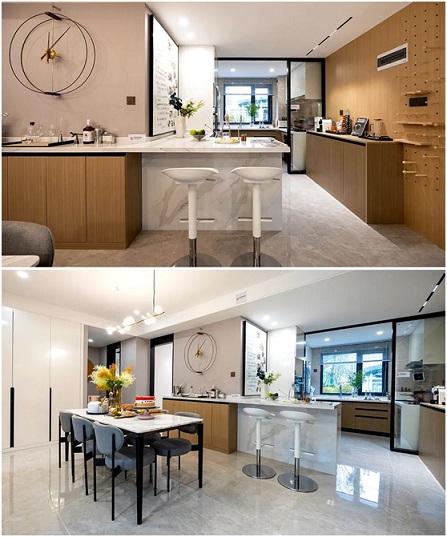 目前家庭居住結(jié)構(gòu)越來(lái)越多元化,家庭成員也有各自不同的居住訴求,S20成長(zhǎng)家產(chǎn)品體系通過(guò)打造中島廚房,實(shí)現(xiàn)中西廚雙廚房、餐廚貫通一體化!爸袓u”廚房預(yù)留中島、水吧臺(tái)等功能區(qū),令生活空間得以靈活延展;同時(shí)增加隱藏式壁櫥收納空間,將收納容量做到了11-13個(gè)立方,遠(yuǎn)超常規(guī)同面積段房屋7-8立方的日常收納容量。