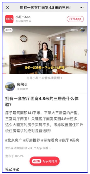 日前,王慧在小紅書發(fā)布了自己創(chuàng)作的一條名為《擁有一套客廳面寬4.8米的三居是什么體驗(yàn)?》的房源短視頻。視頻中,王慧幾乎沒用任何花銷的剪輯特效,而是站在居住者的角度樸素地介紹了一套位于北京市昌平區(qū)回龍觀龍錦苑的大三居。從粉絲后臺留言咨詢、到線下帶看,再到協(xié)助雙方談判最終完成簽約,僅僅4天的時(shí)間,她就賣掉了這套價(jià)值五百多萬的房子,實(shí)現(xiàn)了房產(chǎn)領(lǐng)域的“視頻帶貨”。