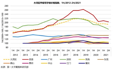2021年下半年,盡管大灣區(qū)經(jīng)濟(jì)持續(xù)復(fù)蘇,但受奧密克戎席卷全球、市場供過于求持續(xù)、部分大型開發(fā)商面臨一定資金壓力的共同影響,大灣區(qū)甲級寫字樓租金和價格指數(shù)分別環(huán)比下降1.9%和1.6%。