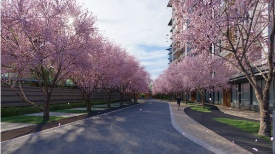 為了與日式禪意奢宅這個定位相呼應,項目還在小區(qū)門口重金打造了一條櫻花大道
