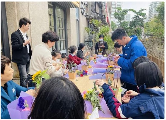 花藝?yán)蠋煘榇蠹抑v解鮮花的常識(shí),大家根據(jù)自己的構(gòu)思,將一支支花插入花籃中,鄰居們?cè)诟惺苊、欣賞美、創(chuàng)造美的過程中,度過了一個(gè)極具特色、意義非凡的節(jié)日。