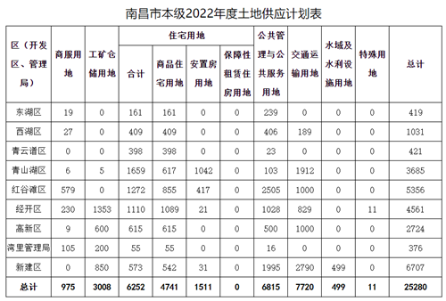 4月12日,南昌市自然規(guī)劃局公布2022年度土地供應(yīng)計劃表,市本級供地計劃總規(guī)模為25280畝,其中工礦倉儲用地3008畝,商服用地975畝,商品住宅用地4741畝,安置房用地1511畝,公共管理與公共服務(wù)用地6815畝,交通運輸用地7720畝,水域及水利設(shè)施用地499畝,特殊用地11畝。