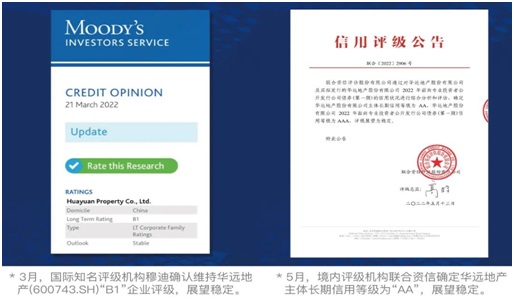 也正是基于如此良好的企業(yè)信譽,使得華遠在市場下行周期,依然能夠獲得國際評級機構(gòu)的認可。2021年,穆迪、標普、惠譽三大國際評級機構(gòu)大規(guī)模下調(diào)房企評級,下調(diào)次數(shù)達127次,僅9、10兩個月就高達40余次。而在今年3月,穆迪對華遠地產(chǎn)繼續(xù)保持“B1”企業(yè)評級,展望穩(wěn)定。5月,境內(nèi)評級機構(gòu)聯(lián)合資信確定華遠地產(chǎn)主體長期信用等級為“AA”,展望穩(wěn)定。