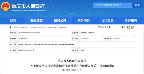 房訊網(wǎng)訊 6月15日,重慶市人民政府網(wǎng)發(fā)布《重慶市促進(jìn)房地產(chǎn)業(yè)良性循環(huán)和健康發(fā)展若干措施》,進(jìn)一步完善我市房地產(chǎn)相關(guān)政策,更好地支持剛性和改善性住房需求,促進(jìn)房地產(chǎn)業(yè)良性循環(huán)和健康發(fā)展。