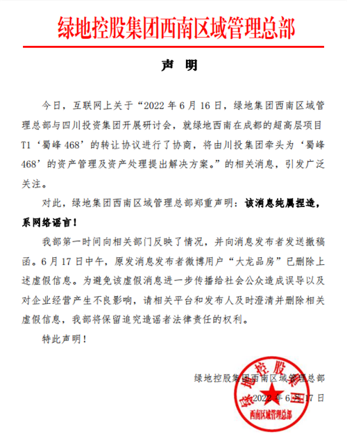 對此,綠地集團(tuán)西南區(qū)域管理總部在聲明中表示:該消息純屬捏造,系網(wǎng)絡(luò)謠言!