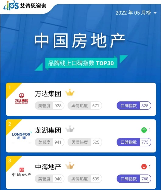 5月線上口碑指數(shù)位列前三的房地產(chǎn)品牌為:萬達集團(825,排名與上月持平)、龍湖集團(775,排名較上月上升1位)、中海地產(chǎn)(768,排名較上月下降1位)。三者的輿情熱度優(yōu)勢顯著,同時,美譽度指數(shù)均在900以上,正面信息占比分別達92.81%、94.13%、94.00%。