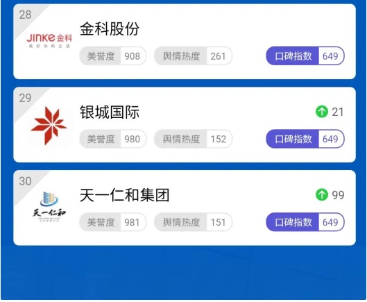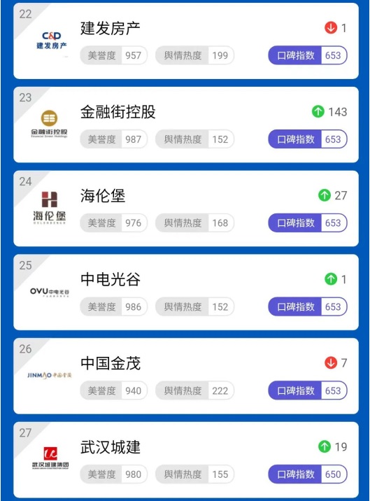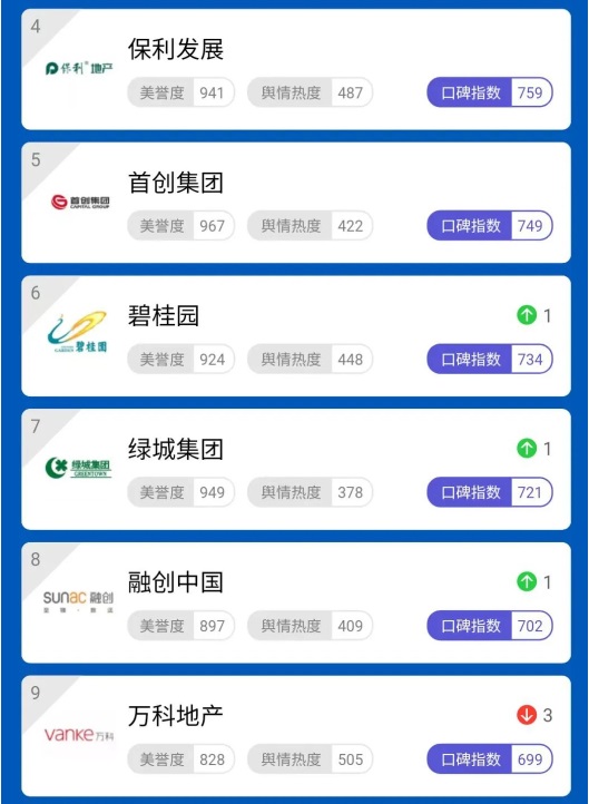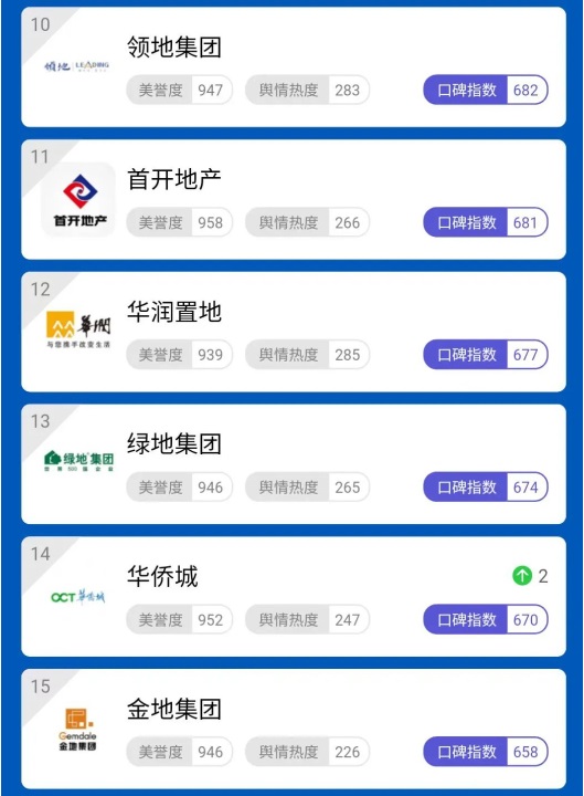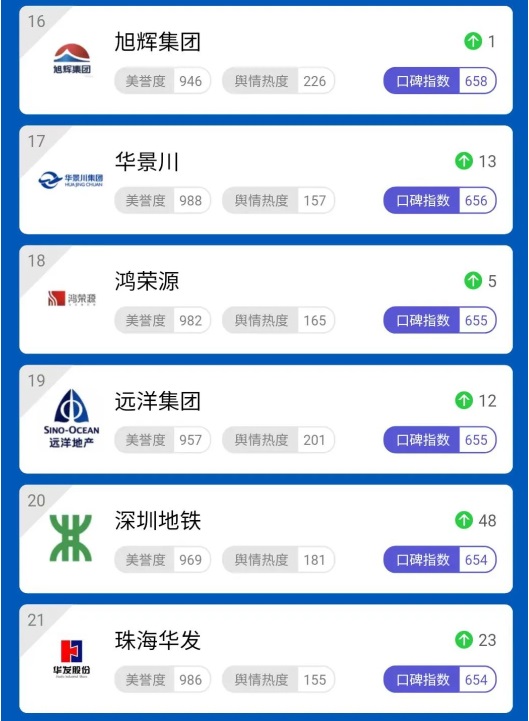 此外,華景川、遠洋集團的線上口碑指數(shù)分別提升13位、12位。