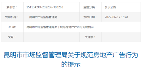 近日,昆明市市場監(jiān)督管理局網(wǎng)站發(fā)布關(guān)于規(guī)范房地產(chǎn)廣告行為的提示,依據(jù)《中華人民共和國廣告法》《房地產(chǎn)廣告發(fā)布規(guī)定》,擬定了22條房地產(chǎn)廣告的具體情形提示,同時(shí)5月至12月,昆明市市場監(jiān)督管理局持續(xù)開展房地產(chǎn)廣告違法行為專項(xiàng)整治。