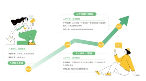人才標準定義了企業(yè)需要什么樣的人才,是企業(yè)最基本的人才評價指引。校招人才標準的持續(xù)迭代也充分體現(xiàn)了貝殼閉環(huán)型校招組織的特性。在貝殼校招人才標準梳理, 從初創(chuàng)期的粗放型的經驗階段,到基于社招積累形成初步校招人才標準,再到現(xiàn)在“人才五力”模型為基礎的校招人才能力模型,引入科技評價手段、精細化評價標準和賦能 面試官缺一不可。