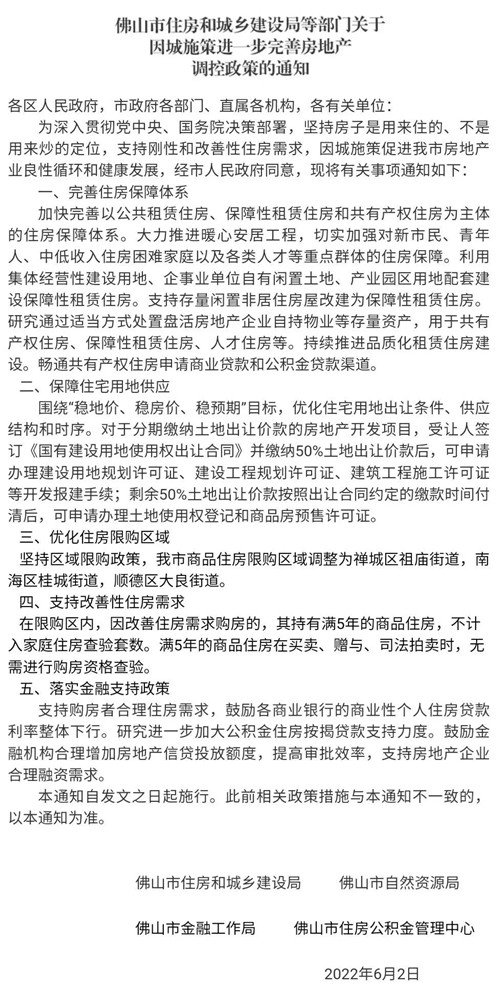 6月2日,《佛山市住房和城鄉(xiāng)建設(shè)局等部門關(guān)于因城施策進(jìn)一步完善房地產(chǎn)調(diào)控政策的通知》發(fā)布,明確佛山商品住房限購區(qū)域調(diào)整為禪城區(qū)祖廟街道、南海區(qū)桂城街道、順德區(qū)大良街道。