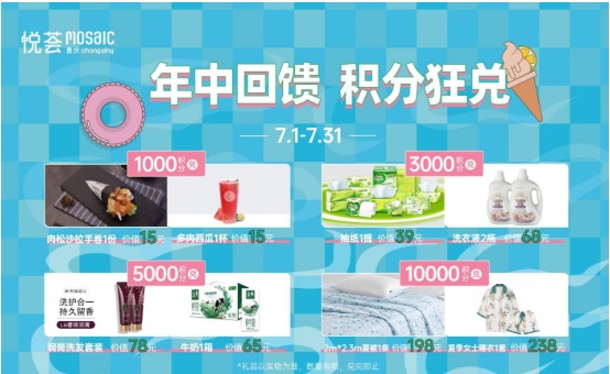 7月1日—7月31日年中大促期間,重慶悅薈誠(chéng)意滿滿,1000積分兌換小玩子肉松沙拉手卷、樹(shù)夏多肉西瓜飲品;3000積分兌換心相印抽紙、酵素洗衣液;5000積分兌換進(jìn)口洗發(fā)水套裝、金典牛奶、艾美家安睡枕;10000積分兌換艾美家夏被、JU夏季女士睡衣,等活動(dòng)成為活動(dòng)一大爆點(diǎn),有效吸引了更多到場(chǎng)客流進(jìn)店消費(fèi),從而獲得了更高的消費(fèi)轉(zhuǎn)化率。