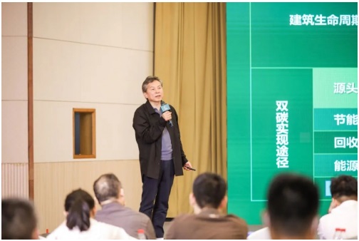 在之后的專題研討環(huán)節(jié),千年舟新材科技集團股份有限公司董事長、浙江省建筑裝飾行業(yè)協(xié)會副會長、高級經(jīng)濟師陸銅華受邀出席,向線上線下的與會者發(fā)表《助力“雙碳”發(fā)展深入綠色建材研發(fā)與裝配式木結構建筑應用》專題演講。
