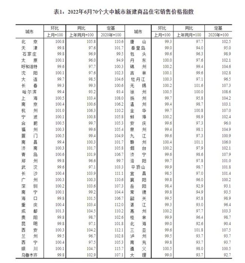2022年6月70個(gè)大中城市新建商品住宅銷售價(jià)格指數(shù)。截圖自國(guó)家統(tǒng)計(jì)局官網(wǎng)
