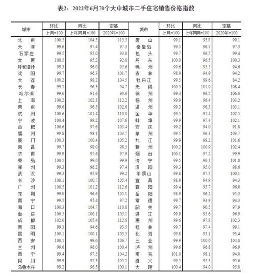 2022年6月70個(gè)大中城市二手住宅銷售價(jià)格指數(shù)。 截圖自國(guó)家統(tǒng)計(jì)局官網(wǎng)