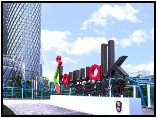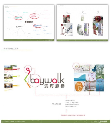 (項(xiàng)目logo 以廊橋的三層(段) 概念、地理圓形造形及具流動(dòng)感的Baywalk 字體所組成)