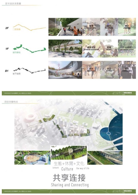 二層為天橋連廊,一層為城市綠地,地下層為商業(yè)、文化和娛樂(lè)活動(dòng)空間,集生態(tài)、休閑及文化為一體。項(xiàng)目重點(diǎn)精神在于“共享與連接”。
