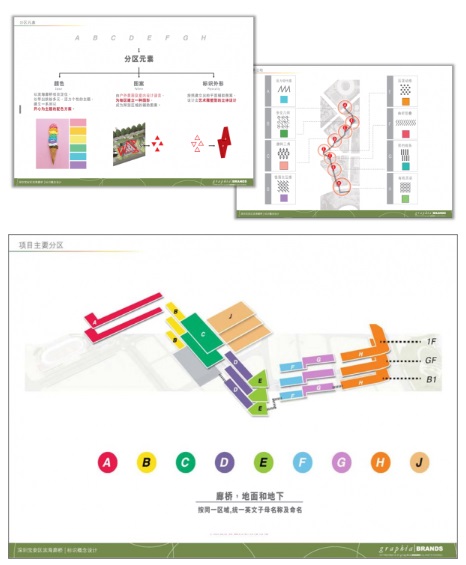 在標(biāo)識(shí)具體設(shè)計(jì)方面,Graphia革思亞隨著項(xiàng)目的品牌價(jià)值定位 - 寶安區(qū)的“綠色心臟”來(lái)發(fā)展,以L(fǎng)ogo強(qiáng)調(diào)的圓形単體,加上反映城市脈搏跳動(dòng)的高低節(jié)奏剪影,套入?yún)^(qū)域?qū)兕伾,?chuàng)造了“A-J”八區(qū)九地的特色地標(biāo);再按策略階段定下的標(biāo)識(shí)架構(gòu),設(shè)計(jì)了其馀的標(biāo)志項(xiàng)目。因應(yīng)廊橋偌大的戶(hù)外空間,Graphia革思亞原建議的標(biāo)志設(shè)計(jì)和尺寸是以較活潑多變的大型圖標(biāo)方式呈現(xiàn),以助打造現(xiàn)場(chǎng)氣氛,但最終按其他顧問(wèn)及客方意見(jiàn)把標(biāo)志縮小及集中于展現(xiàn)其導(dǎo)示功能。