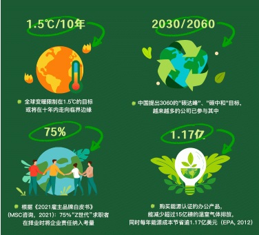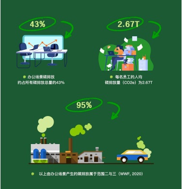 辦公場(chǎng)所作為“第二空間”,每個(gè)職場(chǎng)人在此會(huì)度過的時(shí)間約占生命的1/3,是人類除去睡眠之外耗費(fèi)最長(zhǎng)的時(shí)段。因此,辦公場(chǎng)景下的碳排放量足夠可觀。