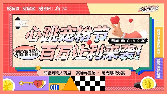 百萬鉅惠,心跳來襲!8月18日-9月30日,由58同城、安居客、58愛房和巧房共同發(fā)起的“818心跳寵粉節(jié)”活動(dòng)盛大開啟。本次活動(dòng)將聚焦用戶看房、選房、訂房核心場(chǎng)景升級(jí),緊緊圍繞經(jīng)紀(jì)人線上數(shù)字化營銷需求,通過全面升級(jí)互動(dòng)玩法、創(chuàng)新活動(dòng)落地形式、百萬鉅惠送福利等方式,全面助力B端合作伙伴提升機(jī)構(gòu)交互粘性,以節(jié)日營銷+造節(jié)氛圍,結(jié)合運(yùn)營政策讓利為合作機(jī)構(gòu)及KA機(jī)構(gòu)賦能,全面助力C端用戶安心鉅惠選好房!