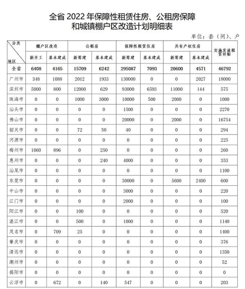 廣東省近日公開的《2022年保障性租賃住房、公租房保障和城鎮(zhèn)棚戶區(qū)改造計(jì)劃》顯示,2022年,廣東省計(jì)劃新開工棚戶區(qū)改造房6408套,新籌建公租房1.57萬套、保障性租賃住房29.51萬套、共有產(chǎn)權(quán)住房2.06萬套。