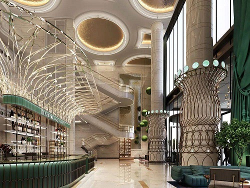 蘇州吳中萬達美華酒店保留了原有石材墻面和地面,讓材料承載著時光的記憶,通過在背景墻上增加金屬裝飾屏風(fēng),以此打開"穿越時空"之門。