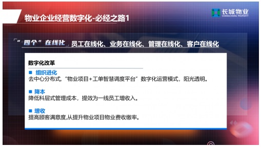 蔣偉談到物業(yè)企業(yè)經(jīng)營數(shù)字化有兩個必經(jīng)之路:“第一個必經(jīng)之路是四個在線化:員工在線化、業(yè)務(wù)在線化、管理在線化、客戶在線化。我們認為「物業(yè)項目+工單智慧調(diào)度平臺」的數(shù)字化運營模式,陽光透明,這在未來會成為一個主流!