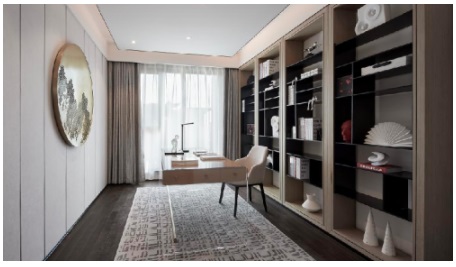 二層主臥克制守序,色調(diào)柔和,氛圍舒心,家具、用色和裝飾美學(xué)混用,不管窗外如何喧囂吵鬧、紅塵紛擾,你只想沉浸于此。它不僅是身體的?刻帲蔷竦臈⒌。而位于主臥的書房,在干練中透著一股英氣,就像一位君子,沉靜而雅致,自由而獨(dú)立。
