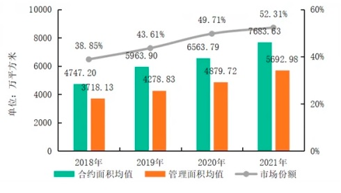 圖:2018-2021年百強企業(yè)合約面積、管理面積及市場份額變化情況