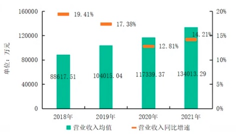 圖:2018-2021年百強企業(yè)營業(yè)收入均值與增速情況