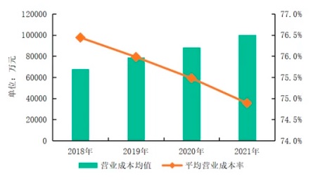 圖:2018-2021年百強企業(yè)營業(yè)成本均值及平均營業(yè)成本率情況