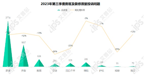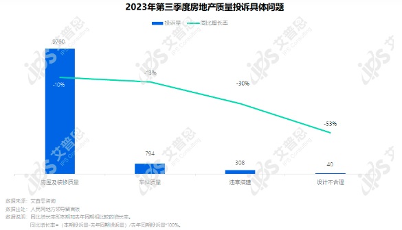 2023年第三季度,質(zhì)量投訴中房屋及裝修質(zhì)量相關(guān)投訴9760起,較去年同期下降10%;車位質(zhì)量相關(guān)投訴794起,較去年同期下降13%;違章搭建、設(shè)計(jì)不合理相關(guān)投訴分別為308起、40起。