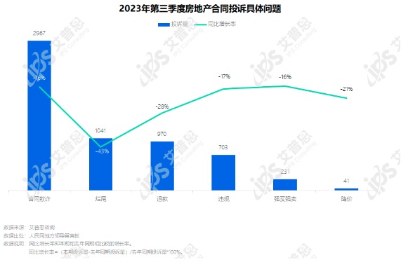 2023年第三季度,合同類投訴中合同欺詐投訴量2967起,較去年同期下降16%,主要涉及面積縮水、虛假宣傳等問題;爛尾投訴1041起,較去年同期下降43%;退款投訴970起,較去年同期下降28%。違規(guī)、強(qiáng)買強(qiáng)賣、降價(jià)相關(guān)投訴較去年同期分別下降17%、16%、21%。