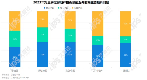 從投訴分類來看,2023年第三季度綠地控股、融創(chuàng)中國服務(wù)問題居多,占比均為45%;中國恒大、萬科地產(chǎn)質(zhì)量投訴較多,占比分別為45%、44%;碧桂園各類投訴分布相對均衡。