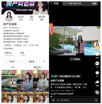 “在珠三角地區(qū),快手的直播賣房真的行得通嗎?賬號(hào)流量效果向好,后續(xù)真的會(huì)有可觀的生意轉(zhuǎn)化嗎?”2022年底,廣州房產(chǎn)主播“房產(chǎn)女老板”(快手ID:2948783368)盧文清在快手運(yùn)營(yíng)了大半年,粉絲量就超過了2.3萬,即便心里藏著不少對(duì)快手房產(chǎn)生意轉(zhuǎn)化的疑慮,但盧文清依舊堅(jiān)持對(duì)快手運(yùn)營(yíng)下功夫。