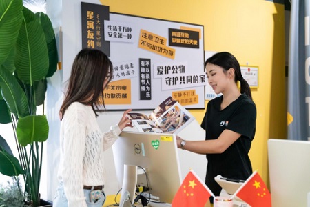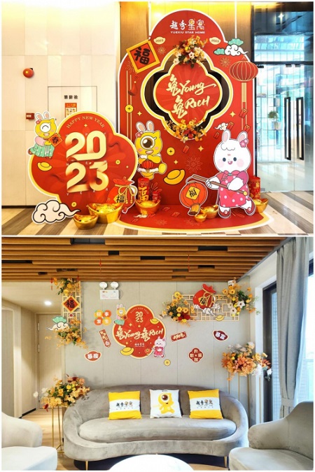 在越秀星寓三元里店,管家們貼上新年窗花,門口萌兔迎門,前臺紅色金色搭配的福筒插花,帶來喜氣洋洋的節(jié)日氛圍!