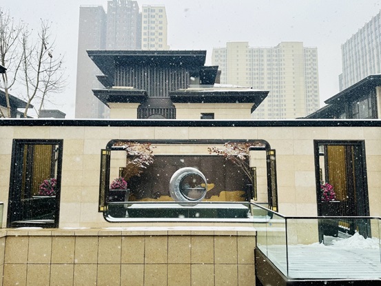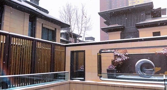 與庭前賞雪相得益彰的,還有魯能·釣魚臺美高梅別墅古樸典雅的中式建筑美學(xué)。雙坡屋頂、飛檐斗拱、銅制格柵、門堂回紋、詩畫景墻……每一處精心設(shè)計都深得傳統(tǒng)居住之精髓,將中式建筑的清雅含蓄、端莊豐華體現(xiàn)得恰到好處,簡潔的建筑線條在銀裝素裹的世界里,更顯清雅幽深的古風(fēng)美意。