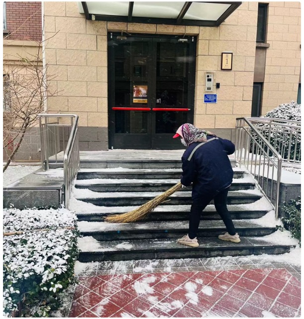 為了確保園區(qū)各出入口、道路等區(qū)域暢通,龐麗帶領(lǐng)著其他工作人員緊鑼密鼓地清理積雪。由于園區(qū)有很多死角區(qū)域無法用機器清理,只能靠人工一點一點鏟除,為了加快效率,龐麗在13日晚上就啟動應(yīng)急預案,安排人員分組、分片、分區(qū)地開展除雪任務(wù)。她和物業(yè)服務(wù)團隊一起努力與時間賽跑,與天氣賽跑,實時關(guān)注著雪量情況,及時進行清掃。