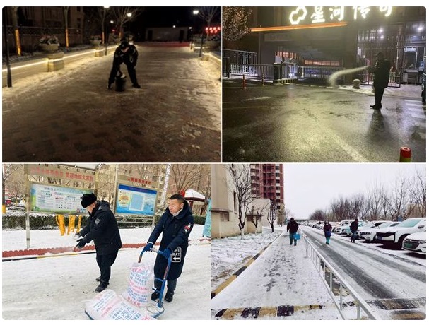 這場暴雪來得及,雪又厚,伴隨著劇烈降溫和大風,帶來重重安全隱患。即使鏟除了積雪,還有比雪更危險的,是冰凍。當積雪融化后,一旦氣溫下降,極其容易結(jié)冰。因此,星河智善生活物業(yè)服務(wù)團隊不僅時刻關(guān)注路面除雪情況,還采取鋪設(shè)防滑墊、撒鹽化雪等措施,防止業(yè)主滑倒摔傷,也確保了車輛的行駛安全。