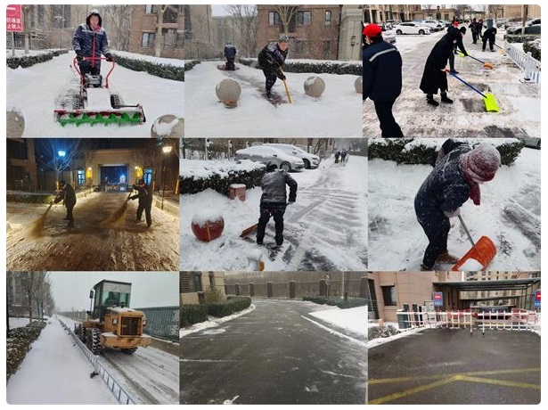 此次除雪行動,天津星河智善生活共出動300余人鏟雪,機械推雪鏟5臺,噴灑融雪劑15噸,鏟車鏟雪10臺,除雪鏟175個,吹雪機10臺等等。大雪不停工作不停,大雪停了他們?nèi)栽谇謇矸e雪,所有人的心里只有一個目標:竭盡全力,快速清理積雪,保暢通保安全!