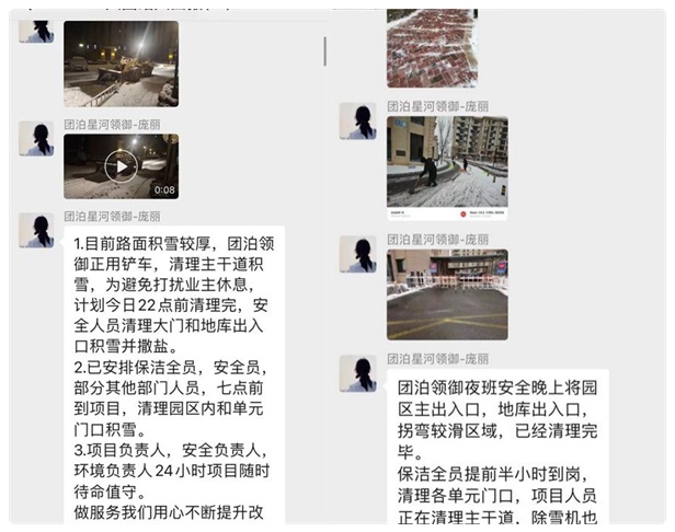 此外,各小區(qū)還通過業(yè)主群、朋友圈等方式傳遞下雪天的注意事項,同時加強對困難群體、獨居老人的慰問走訪,叮囑他們做好保暖御寒準備。物業(yè)服務(wù)團隊的點滴付出,業(yè)主們都看在了眼里,紛紛豎起了大拇指,業(yè)主群內(nèi)也是連連稱贊。