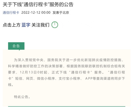 12月13日0時起,“通信大數(shù)據(jù)行程卡”正式下線了,這意味著各城市之間的商務(wù)往來不再受限,全社會經(jīng)濟活動將逐漸回歸常態(tài)。