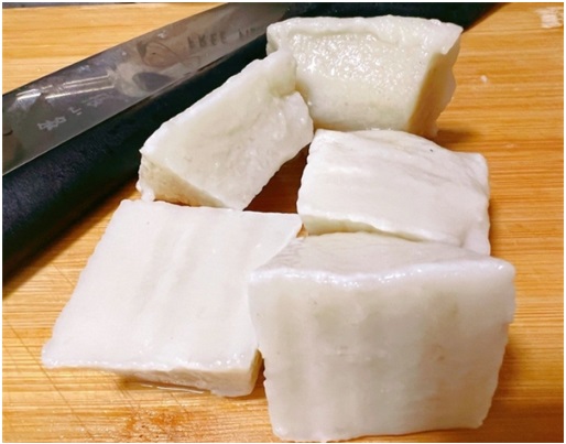 寧波水磨年糕是少數(shù)用晚粳米(大米的一種)做的年糕,晚粳米中更多的是直鏈淀粉,在口感上更韌,口感滑爽,久煮不爛,搭配雪菜和冬筍絲一起燒煮,就是地道的寧波家常美味。
