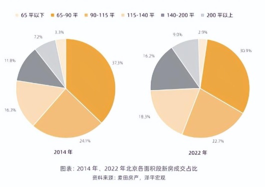 《報(bào)告》顯示,2022年,北京單價(jià)10萬(wàn)以上住宅成交量創(chuàng)歷史新高,且北京改善性需求占比54.0%,已超越剛需成為住宅市場(chǎng)增長(zhǎng)新動(dòng)能。數(shù)據(jù)顯示,從新房市場(chǎng)看,2014—2022年三居室成交占比從35.9%增至39.1%,115-140平方米、140-200平方米、200平方米以上成交占比分別從16.3%、11.8%、7.2%升至18.3%、16.2%、9.0%。